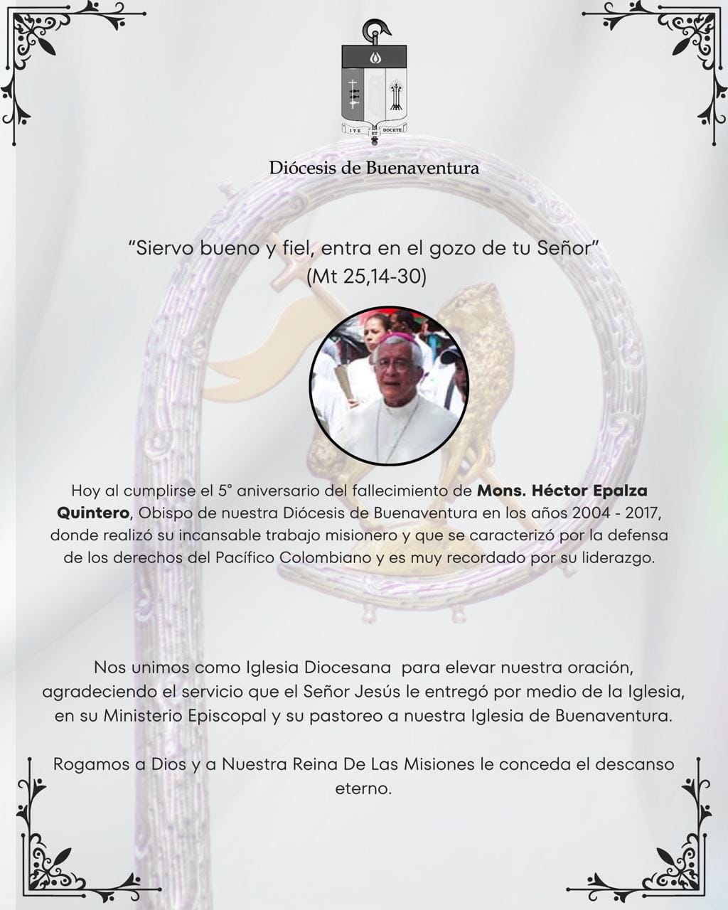 La Diócesis de Buenaventura invita a todos los fieles a participar en la Solemne Eucaristía con motivo del V aniversario de la Pascua de Mons. Héctor Epalza Quintero, para orar y dar gracias por su vida, su ministerio episcopal y su entrega pastoral al pueblo de Dios.
