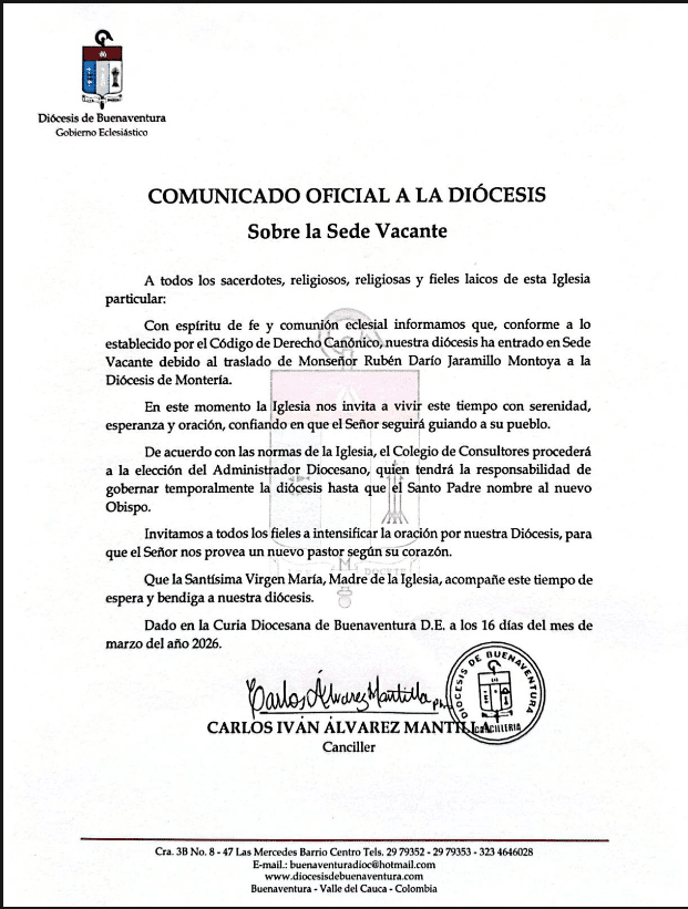 La Iglesia celebra el nombramiento de Monseñor Rubén Darío Jaramillo Montoya como nuevo Obispo de la Diócesis de Montería. Este llamado es signo de confianza en su servicio pastoral y en su compromiso con la misión evangelizadora.